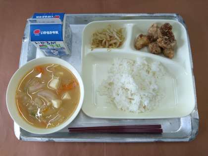 ●豚肉の香味あげ ●みそ汁 ●もやしのおひたし ●ごはん ●牛乳 でした。