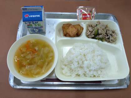 ●ゴーヤチャンプルー ●すまし汁 ●あつあげのしょうがじょうゆかけ ●ごはん ●牛乳 でした。
