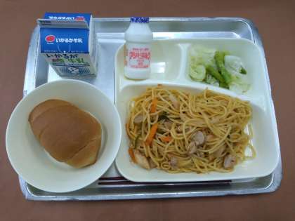 ●チキントマトスパゲッティ ●グリーンアスパラガスとキャベツのサラダ ●発酵乳 ●パン(1/2) ●牛乳 でした。