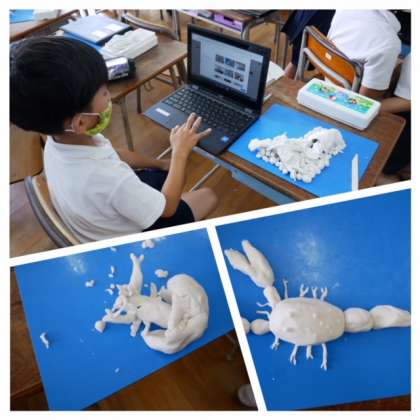 図工の時間に子どもたちが1人1台端末で確認しながら、何やら紙粘土で造形しています。細長くて、力強くて、ピンと飛び跳ねそうで、大きなはさみをゆり動かす生物。さて、何をつくっているのでしょう。