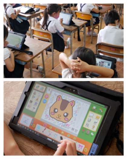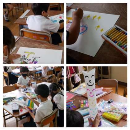 今日の写真は1年生のようすです。2限に教室をのぞいてみると、1組はタブレットPCを使う練習をおこなっていました。1年生でも戸惑いなく使いこなしていることに今さらながら驚きです。2組はパスで想像をふくらませた自転車の絵を描いていました。子どもたちの想像力はとどまるところを知りません。3組はビニールに絵を描きニョキニョキ伸びる作品の仕上げです。思い通りに仕上がったかな。