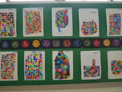 階段を降りていくと、1年生の作品の掲示物がありました。心が癒されるひと時です。