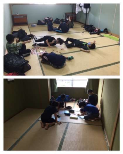ネイチャーゲームから戻り、夕食と入浴時間までのひと時、それぞれの部屋ですごしています。班長会議の内容を伝達したり、カードゲームで遊んだり。これもまた楽しい時間です。
