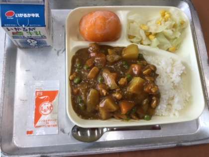 ●チキンカレーライス(米粉) ●キャベツとコーンのサラダ(ノンエッグドレッシング) ●冷凍みかん ●牛乳 の献立でした。
