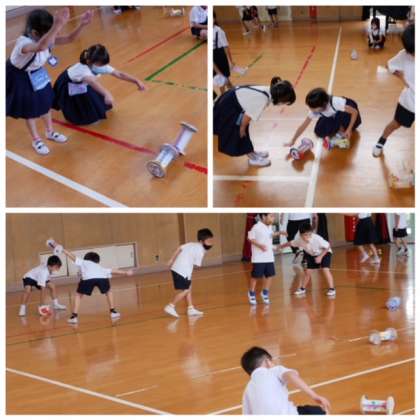 先週末にお伝えした「紙皿コロコロ」。それぞれ思いおもいの飾りつけで満足のいく作品ができたようです。今日は完成おひろめのコロコロデー。体育館で、自由に転がしてみました。並んで順に転がしたわけではないので、何やらよくわからない写真ですが、とても楽しんでコロコロ遊びをしていました。