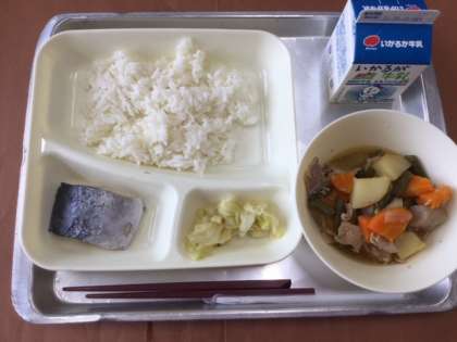 今日の給食は ●サゴシの塩焼き ●豚肉とじゃがいもの煮物 ●キャベツの梅風味 ●ごはん ●牛乳 の献立でした。