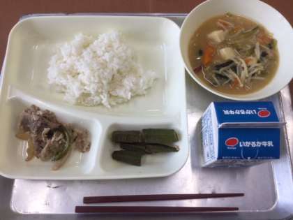 今日の給食は ●豚肉の甘辛焼き ●みそ汁 ●オクラのおかかいため ●ごはん ●牛乳 の献立です。