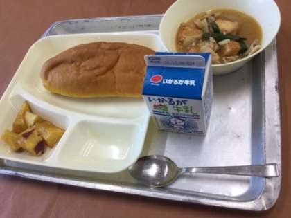 今日の給食は ●豚肉といかの中華煮 ●大学いも ●ミニフィッシュ ●パン ●牛乳 の献立でした。秋色という感じがしませんか。さつまいもが入っているからでしょうか。写真にミニフィッシュを入れるのが抜けていました。