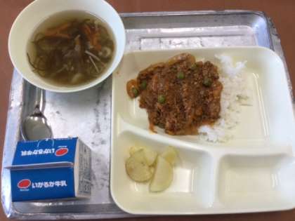 今日の給食は ●タコライス ●もずくのスープ ●焼きじゃが ●牛乳 の献立でした。タコライスってなんだ?たこの切り身がいっぱい入っているごはんか?と思った子はいるかな。