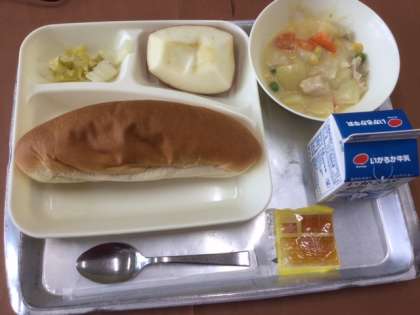 今日の献立は ●コーンクリームシチュー(米粉) ●はくさいのピクルス ●りんご ●コッペパン ●牛乳 ●アプリコットジャム の献立でした。
