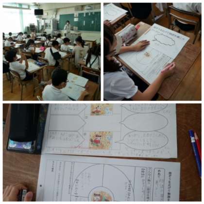 この3枚目の絵に描かれるお話をつくってみよう。そのために、まず、場面設定やたぬきの人物(動物ですが)設定をしてみよう。---という課題です。子どもたちは、想像をふくらませて、たくさん豊かな設定を生みだしていました。