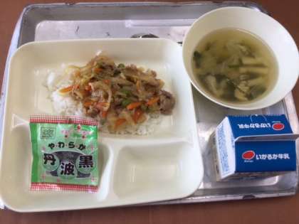 今日の給食は ●ピリ辛どんぶり ●中華スープ ●ソフト黒豆 ●牛乳 の献立です。今日の給食に入っている野菜を並べてみると-----たまねぎ、はくさい、にんじん、グリーンピース、(にんにく)、(しょうが)、キャベツ、たけのこ、にら。たっぷりの野菜です。
