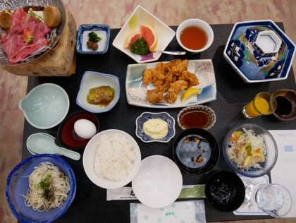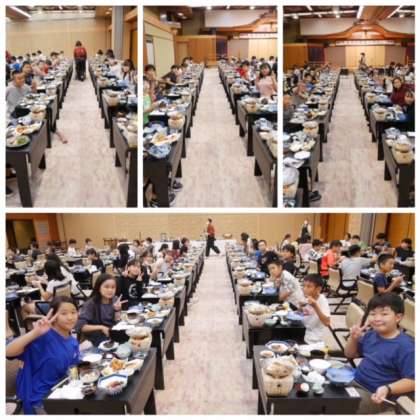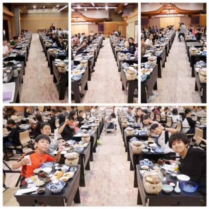 大雑把な写真になってしまい申し訳ないです。大広間で美味しい夕食をいただきました。唐揚げ、お造り、すき焼き、サラダ、味噌汁、そうめん、焼きナス、フレッシュグレープフルーツ、オレンジジュースです。子どもたちにあわせて量もたっぷりです。あー満足でお腹がはち切れそうです。