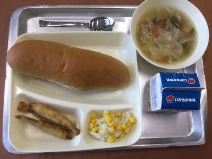 今日の給食は ●わかさぎフライ ●スープ ●カリフラワーとコーンのサラダ ●黒糖パン ●牛乳 の献立です。