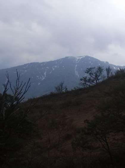 谷沿いの集落を挟んで、氷ノ山がそびえています。頂上付近には残雪がありました