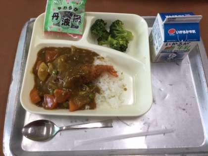 人気のカレーライスにえびフライがのっているなんて!なんてぜいたくなのでしょう。大いに満足して給食をいただきました。