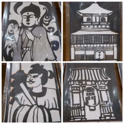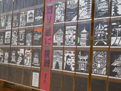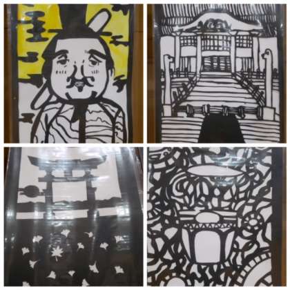 6年生の作品は「切り絵」です。社会科で学習した歴史の1コマを、建物のようすや人物のようす・風景などの情景が伝わるように、細かいところまで気をつけて制作しました。さすが6年生。すばらしい完成度です。