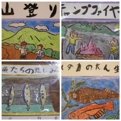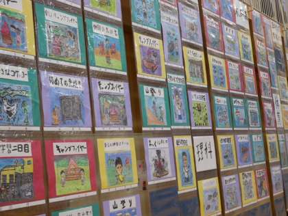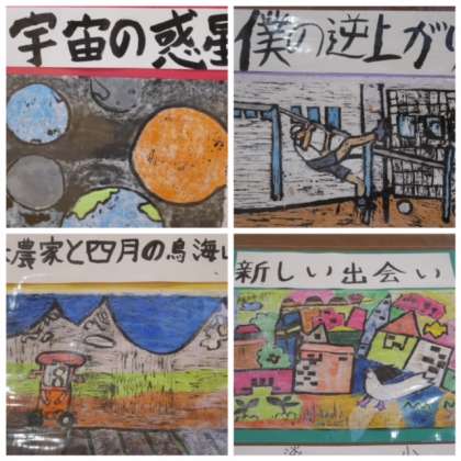5年生の作品は、水彩絵具をつかった色彩豊かな木版画です。5年生で学習した心に残ったことを表現しました。興味や感動など心の動きが伝わる力作ぞろいです。5年生になると題のつけかたも上手で、ストレートに表現した題もひとひねりきかせた題も、立派に作品の一部です。