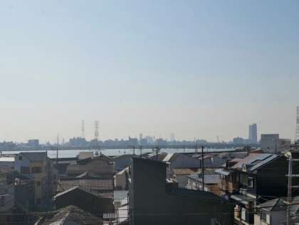 もう1枚の写真は、校舎の4階から海の方向を眺めたもの。この高さからだと海は見えませんが、目の前には淀川が大きく悠々と流れていて、秋空とともに眺めていると、気持ちが安らぎます。