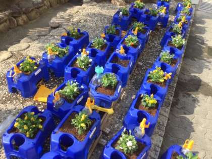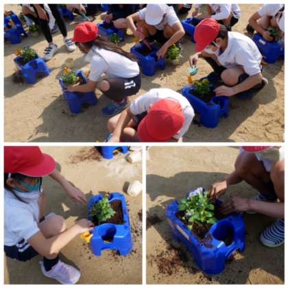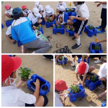 今日もいい天気です。ポカポカと陽光が降り注ぐ運動場で、2年生がミニトマトを育てていたプランタに花の苗を植えていました。ビオラです。きれいな色のかわいい花がたくさん咲きます。正門付近が色とりどりになるのが楽しみです。待ち遠しいです。