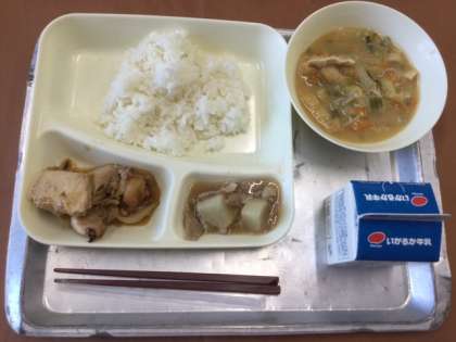 今日の給食は ●鶏肉の甘辛焼き ●みそ汁 ●だいこんの煮物 ●ごはん ●牛乳 の献立でした。