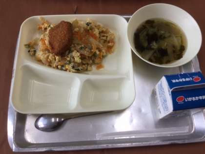 今日の給食は ●カツ丼 ●すまし汁 ●ミニフィッシュ ●牛乳 の献立でした。
