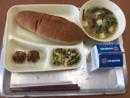 今日の給食は ●あげシューマイ ●とうふのスープ ●ツナとリンゲンサイのいため物 ●黒糖パン ●牛乳 の献立でした。