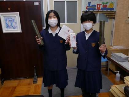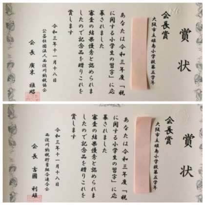 「税に関する小学生の習字」に応募した5年生の作品の中から、2名が見事、「会長賞」の表彰を受けました。残念ながら全校集会をやめていますので、校長室で2名の栄誉をたたえました。