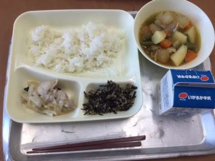 魚ひじきそぼろは給食委員会の放送によると---新製品の「魚ミンチ」と、ひじき、青じそを炒めてつくります。ごはんにあうように、甘辛く味つけし、青じそをくわえて香りと風味を増しています---とのこと。知らないところでずいぶんと手間をかけてもらっているのだなとあらためて思います。