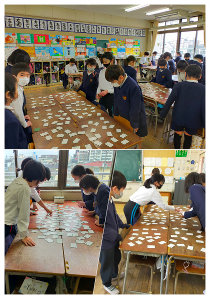 琴と笛の音が聞こえてくる教室を覗いてみると、4年生が百人一首に取り組んでいました。今のところ、上の句から手が伸びる子はなかなかいない様子でしたが、今後、句をたくさん覚える子が出てくるかもしれません。