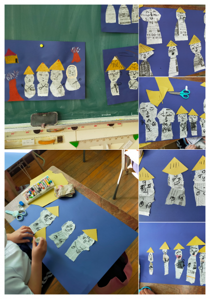 2組は国語で学習している『かさこじぞう』から、地蔵様が並んで立っている様子を紙工作で表現していました。新聞紙の記事のちょっとした様子の違いで、地蔵様の見た目にも変化がありおもしろいです。