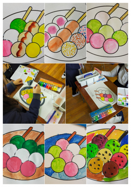 一方の3組では、水彩絵の具で串だんごに色を着けていました。定番の三色団子はやっぱり外せません。他にも、かわいいキャラクターだんごやきらびやかなレインボーだんごなどのたくさんのアイディア商品が並べられていました。