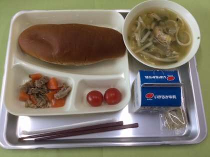 今日の給食は ●ぶた肉と野菜の煮物 ●なにわうどん ●プチトマト ●黒糖パン ●牛乳 の献立です。今日のこだわりの一品は、なにわうどんです。