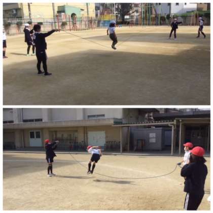 サッカーを習っているのでしょうか。とても上手な子がいて驚きました。きれいにパス交換できた時にはやったーという気持ちです。大縄跳びは息を合わせることがとても大事です。上手に掛け声をだしてタイミングを合わせやすくしているグループがありました。