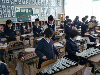3年生の教室をのぞいてみると合奏の練習に取り組んでいました。鉄琴・タンブリン・カスタネット・リコーダー(吹かずに指づかい)の構成です。