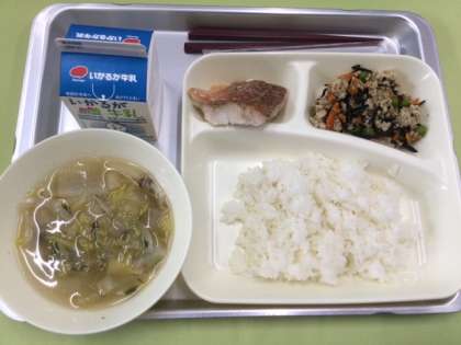 今日の給食は ●あかうおのレモンじょうゆかけ ●うすくず汁 ●高野どうふのいり煮 ●ごはん ●牛乳 の献立でした。手間をかけた和食でした。