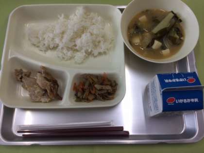 今日の給食は、鶏肉のしょうゆマヨネーズ焼き みそ汁 きんぴらごぼう ご飯 牛乳 の献立でした。