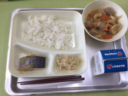 今日の給食は、さごしのおろしじょうゆかけ 一口がんもと里芋のみそ煮 もやしのゆずの香あえ ごはん 牛乳 の献立でした。