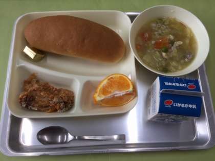 今日の給食は、とうふのミートグラタン 押し麦と野菜のスープ煮 デコポン コッペパン バター 牛乳 の献立でした。