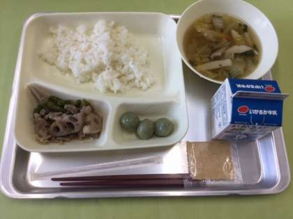 今日の給食は、豚肉とレンコンの炒め煮 五目汁 きな粉よもぎだんご ごはん 牛乳 の献立です。