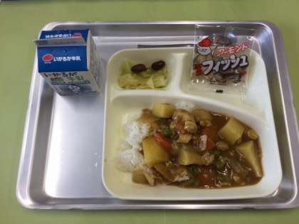 今日の給食は、チキンカレーライス ビーンズサラダ アーモンドフィッシュ 牛乳 の献立でした。