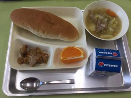 今日の給食は、鶏肉のみそバターソース 洋風煮 デコポン コッペパン 牛乳 の献立でした。