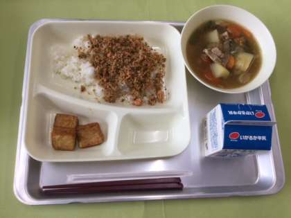 今日の給食は 鶏肉とじゃがいもの煮もの 厚あげのしょうゆだれかけ 紅ざけそぼろ ご飯 牛乳 の献立です。