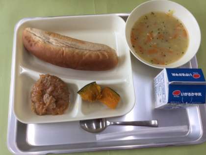 今日の給食は 煮込みハンバーグ コーンとキャベツのスープ 焼きかぼちゃ 黒糖パン 牛乳 の献立でした。洋風献立です。ハンバーグはもちろん美味しかったのですが、コーンとキャベツの両方からの自然の甘みがとけだしていて、スープはとても優しい味でした。調理員さん、今日もありがとうございます。
