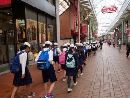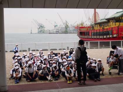 今日は5年生の春の遠足です。阪神電車で元町まで行き、元町の商店街を通ってから海の方向に向かい、着きました。ハーバーランドです。残念ながら有名なポートタワーは工事中ですが、今からロイヤルプリンセス号に乗って神戸港クルーズを満喫します。