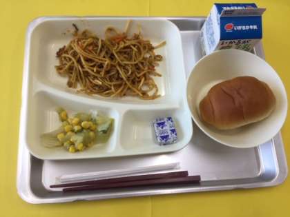 今日の給食は カレースパゲッティ レタスとコーンのサラダ 固形チーズ ハーフ黒糖パン 牛乳 の献立でした。
