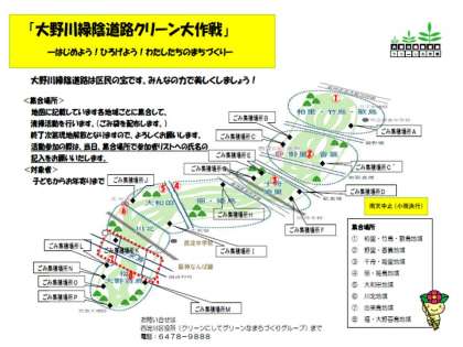 を合言葉に大野川緑陰道路の清掃が予定されています。詳細は、下記のページを参照ください。http://www.city.osaka.lg.jp/nishiyodogawa/page/0000309930.html