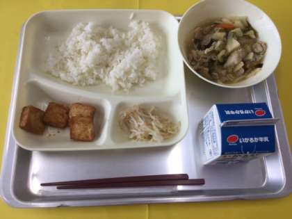 今日の給食は 中華煮 あつあげのピリ辛じょうゆがけ もやしの中華あえ ご飯 牛乳 の献立でした。中華煮にはおどろくほどたくさんの具が入っていました。ぶた肉、キャベツ、タマネギ、タケノコ、ニンジン、ニラ。しかも、種類が多いだけではなく量もたっぷり。幸せです。調理員さん、今日もありがとうございます。