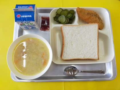 サーモンフライ、豆乳スープ、きゅうりのバジル風味サラダ、食パン、いちごジャムに牛乳