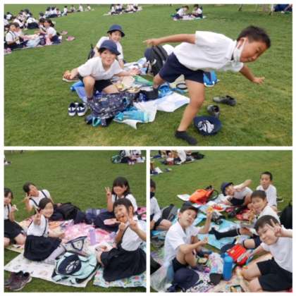 芝生にひろびろと広がって昼食タイム。今日もお弁当の準備ありがとうございます。